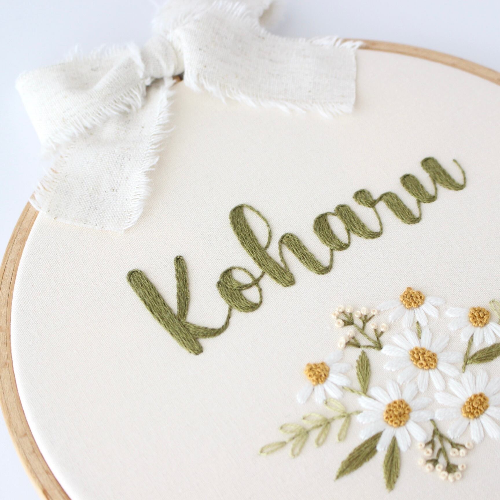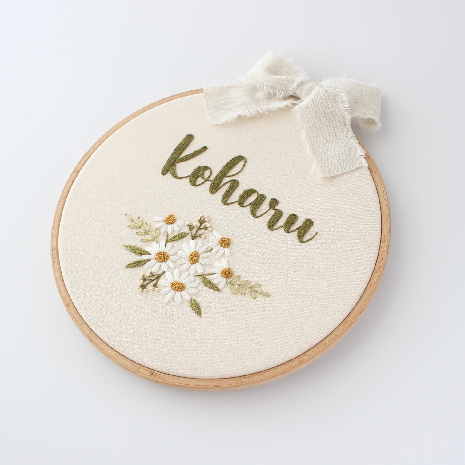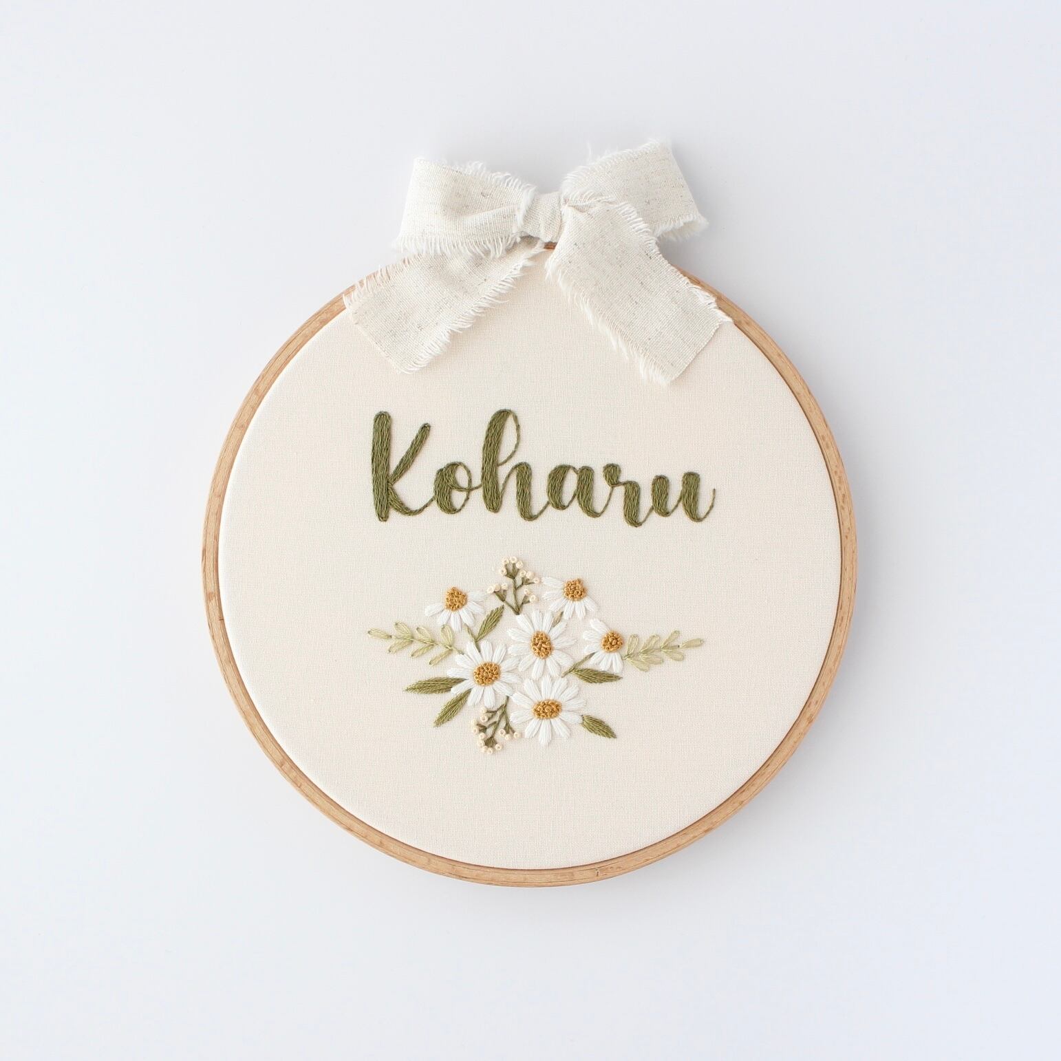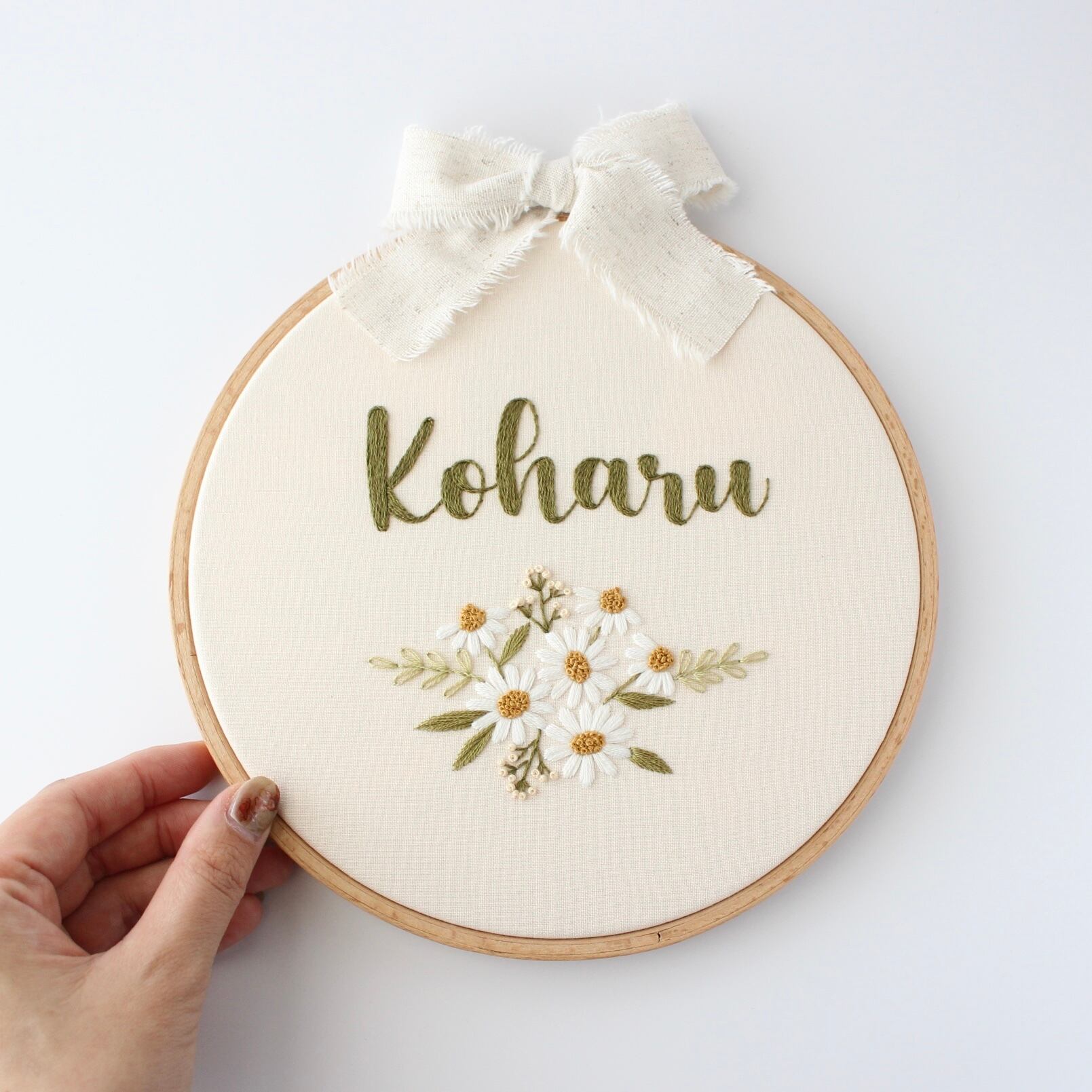 大切な人のお名前を、カモミールをイメージした花々で彩る刺繍アートです。