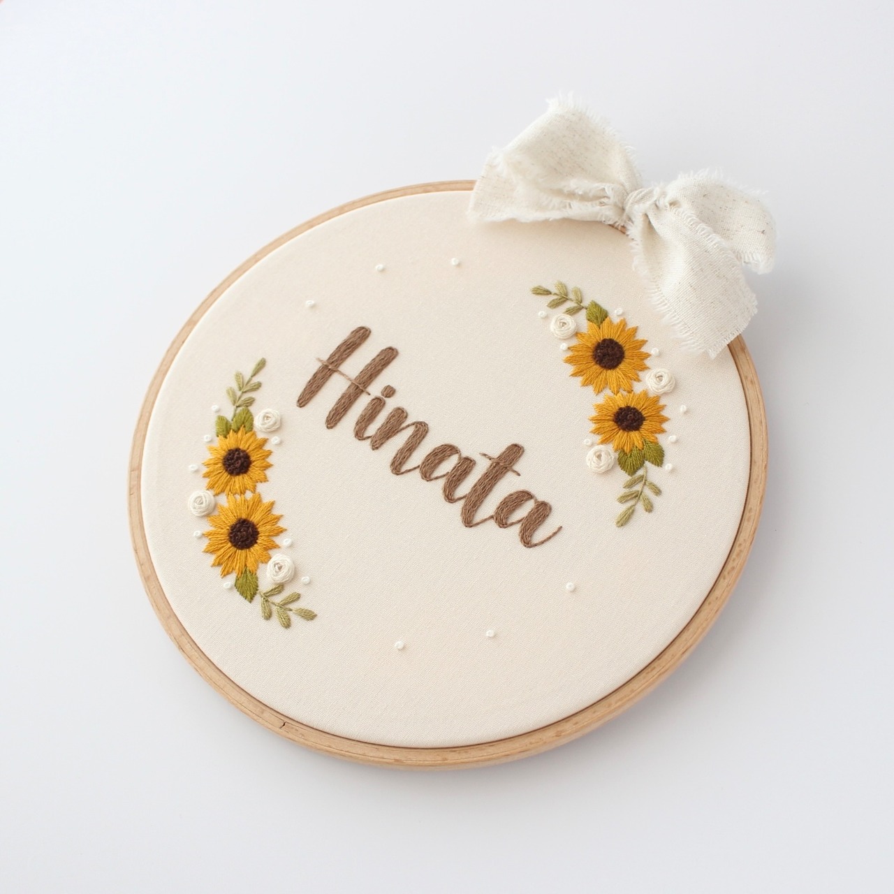 大切な人のお名前を、手刺繍のひまわりで彩る刺繍アートです。